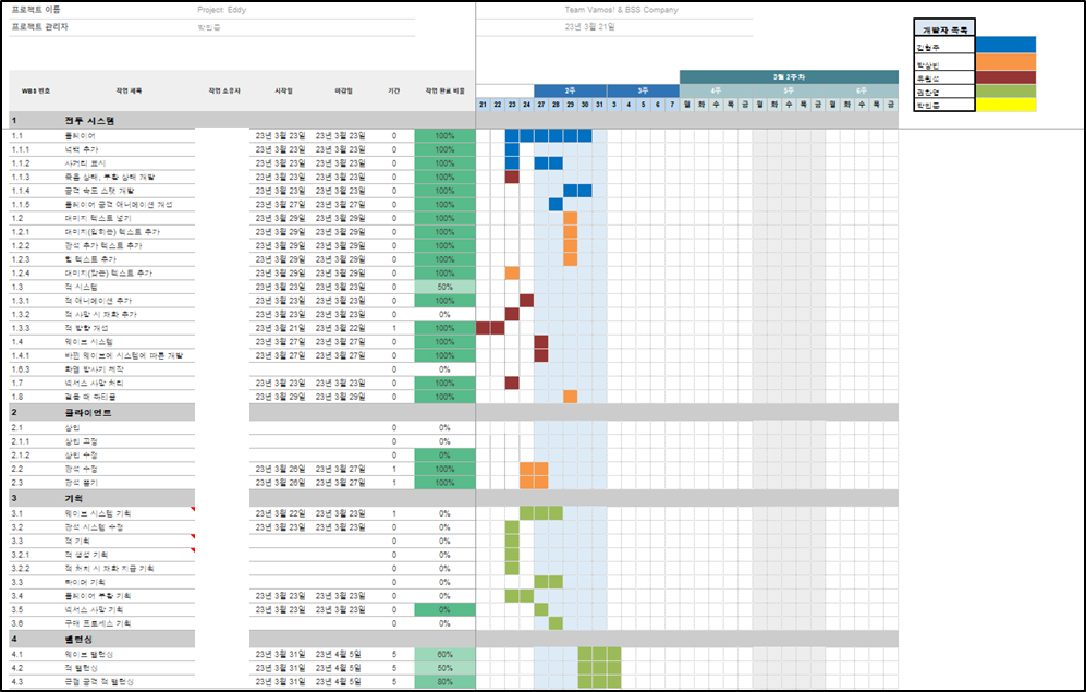 이런 식으로 보통 3개의 단계로 쪼개어 분배하게 된다. 그리고, WBS와 아주 적합한 스케줄링 차트가 있는데, 바로 간트 차트이다. 간트 차트는 시간의 흐름에 따라 작업 내역을 직관적으로 판단할 수 있는 스케줄링 차트로 기본적으로 업무명, 기간, 작업자, 연관 직업을 표기 하고 업무를 Task(해야 할 일)로 나누고 Depth(단계)를 3개 정도로 파고 든다. (1., 1.1., 1.1.1.) 이와 같이 Task를 Depth로 나눴다면, 날짜와 일정을 기재하고 몇%가 진행 됐는, 진척률이 차트에 나오게 된다.