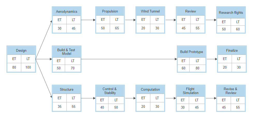 그 외 스케쥴링 차트로는 작업관의 연관을 구조적으로 파악 할 수 있는 Pert Chat가 있고, 테스크명/ES 작업 종료하기까지 (Earliest Start time), EF(Earliest Finish time), LS(Latest Start time), LF(Latest Finish time), 작업자, 연관 작업을 표시한다.