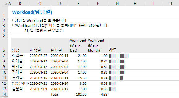 Man-month 지표를 통해 업무 분배하는 방식의 프로젝트 관리 기법 있다. 이는 신입을 기준으로 1로 잡고 분배하는 형태로 파트장은 2..., 프로젝트를 진행 할 때 어느정도에 시간과 예산이 필요한가를 Man-month로 배치하는 방식이다.